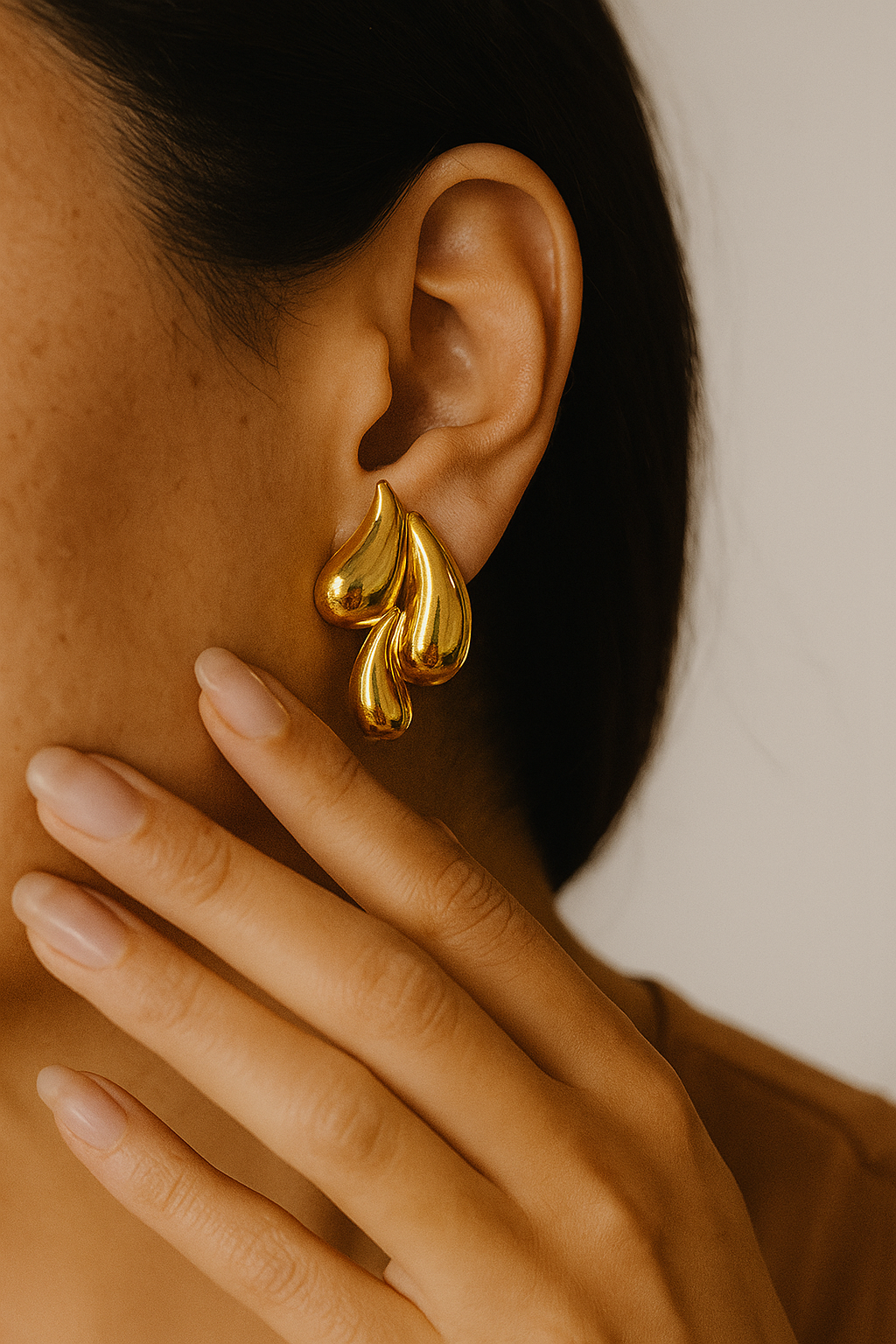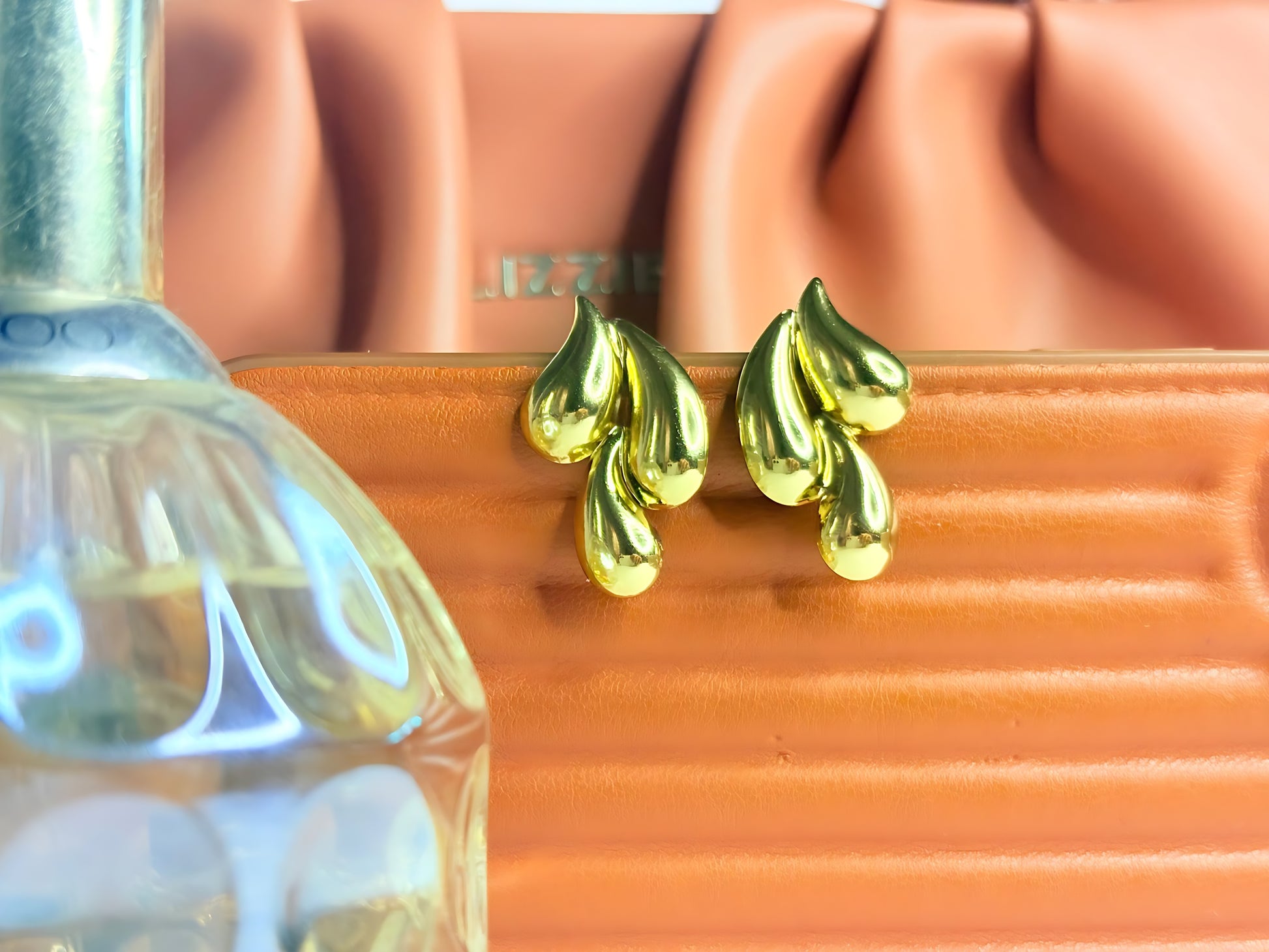 Featuring a cluster of abstract gold teardrop forms, these earrings embody modern elegance with a bold twist. Their glossy finish adds shine and sophistication, making them a perfect choice for elevating any look with a hint of glamour.