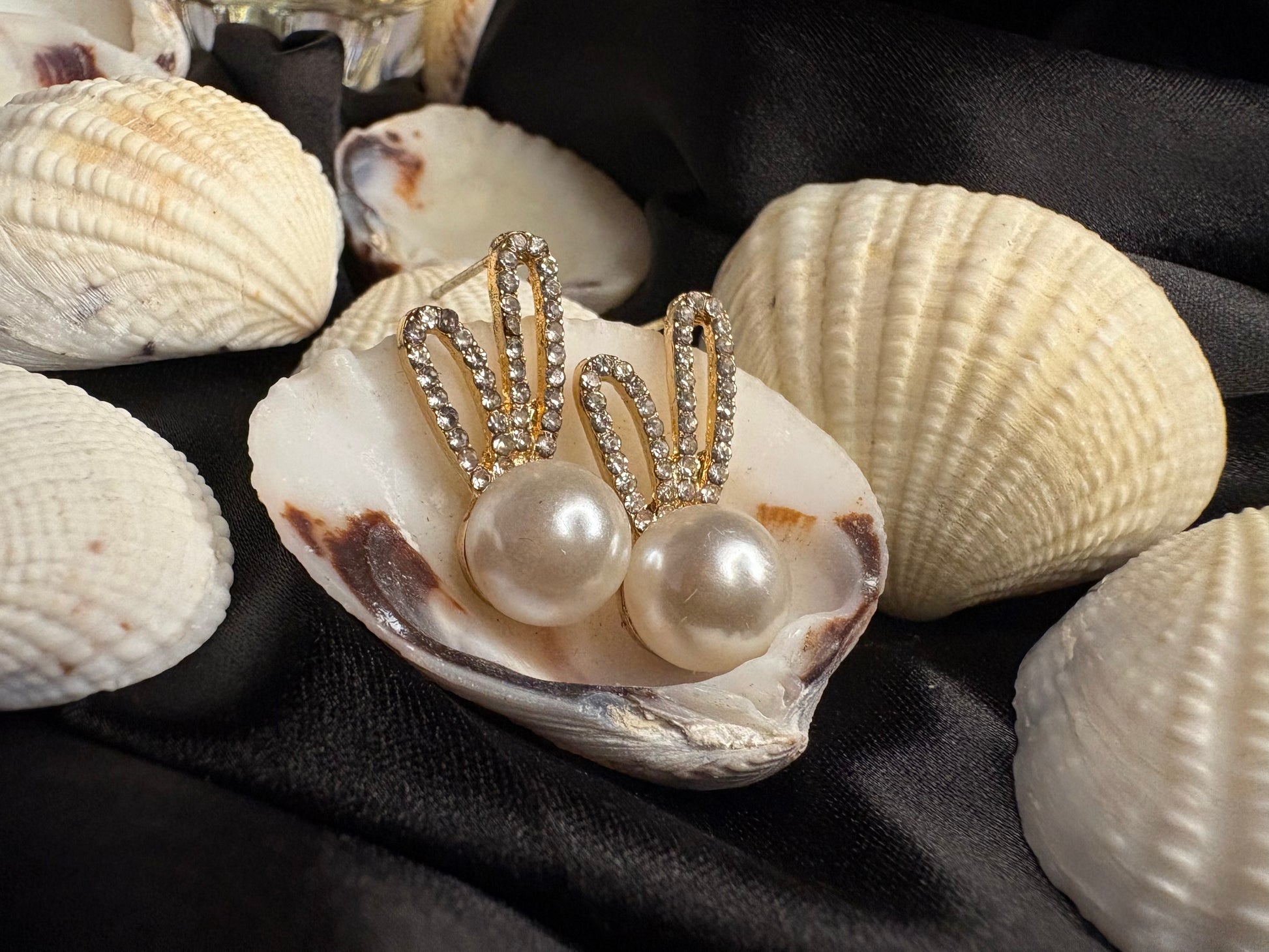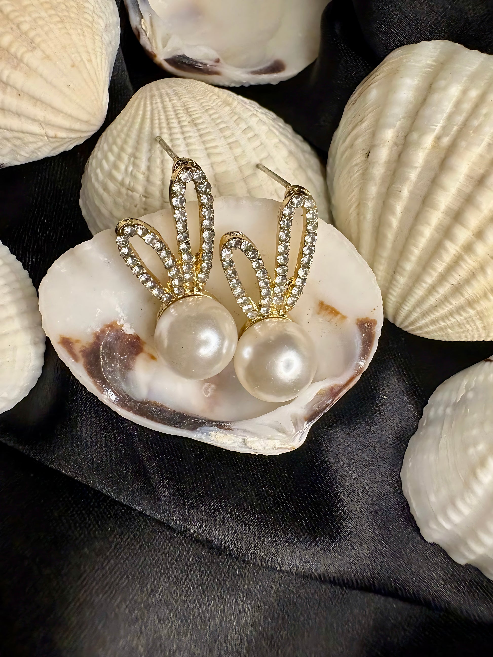 Glam pearl earrings topped with sparkling crystal bunny ears, adding a fun and flirty twist to your classic pearls.