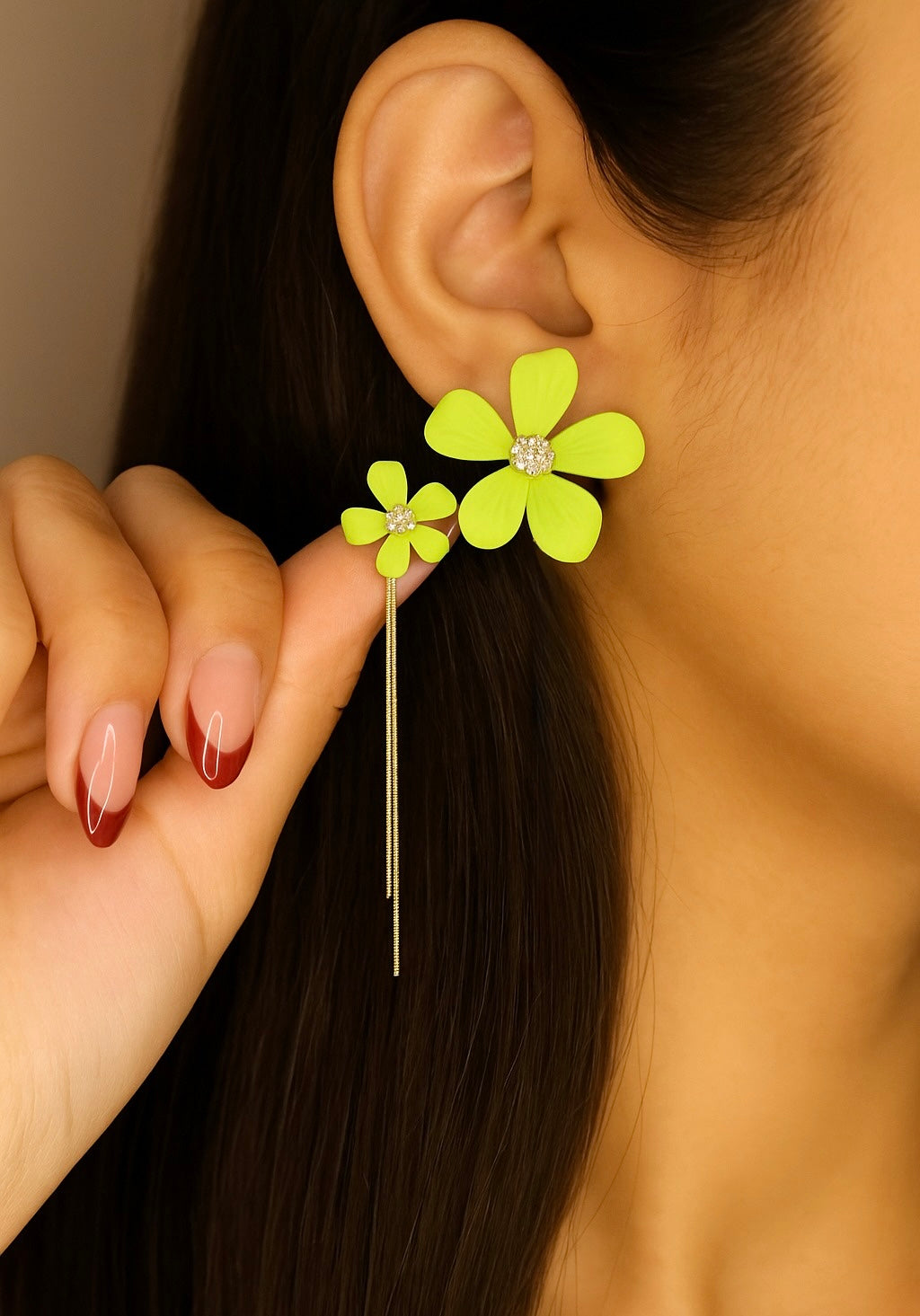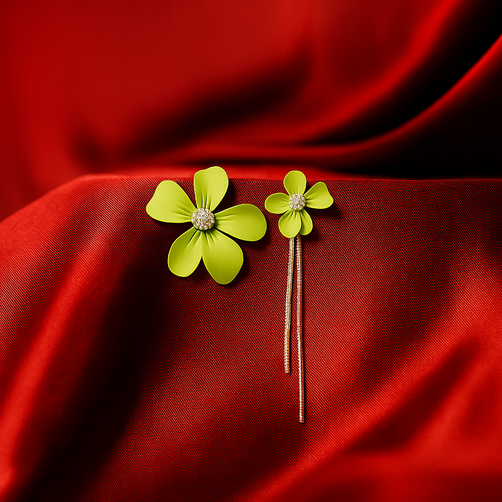 Bold, botanical, and beautifully balanced — these Garden Drama feature a striking matte-finish flower with layered petals in a fresh lime tone. Centered with delicate crystal accents and finished with slim gold chain danglers, these earrings add an unexpected twist to any look. Perfect for when you're in the mood for playful sophistication.
