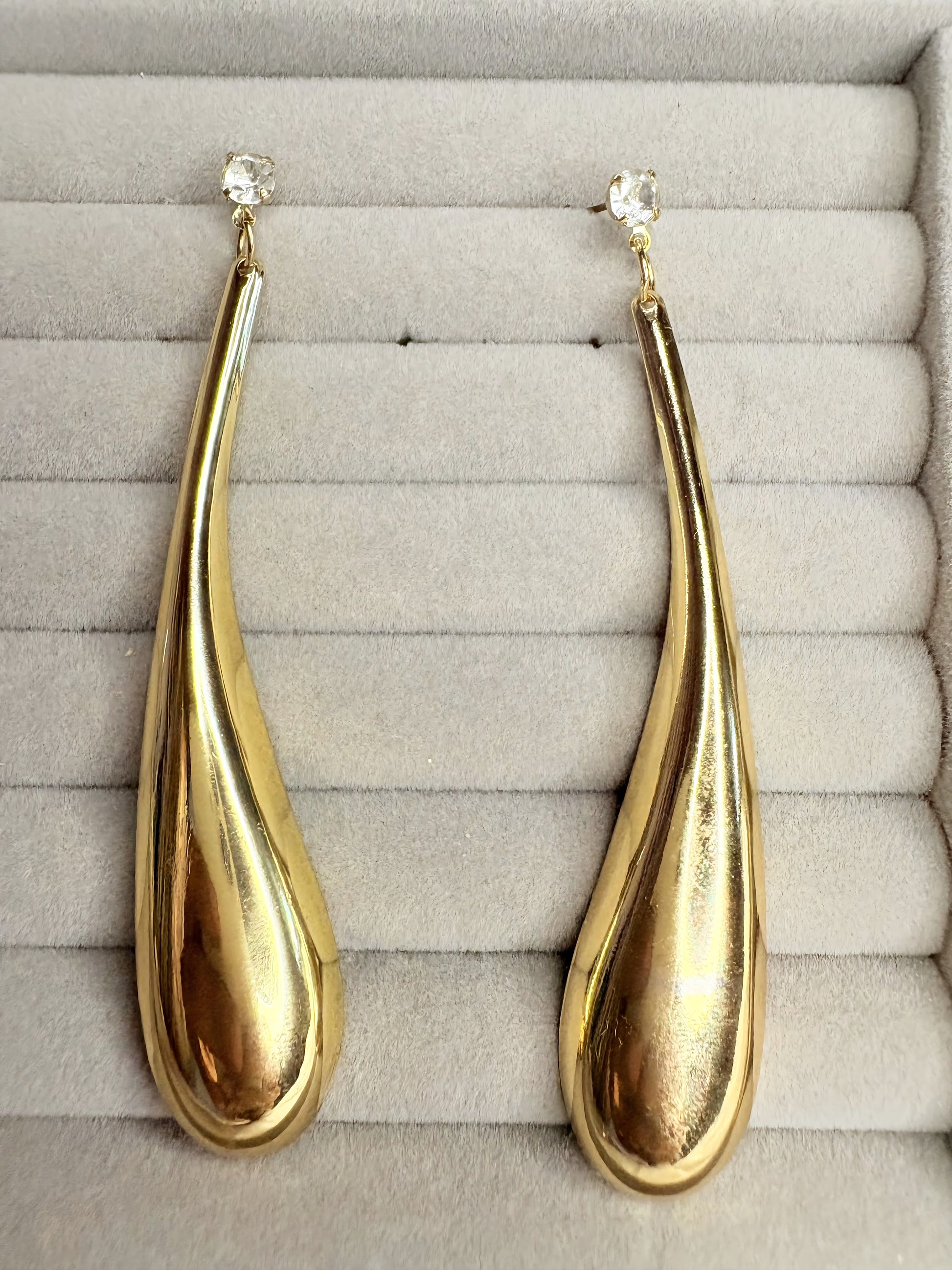 Sleek elongated droplet earrings in glossy gold, paired with a sparkling crystal stud for an elegant yet modern statement look.