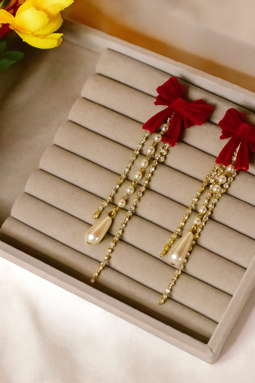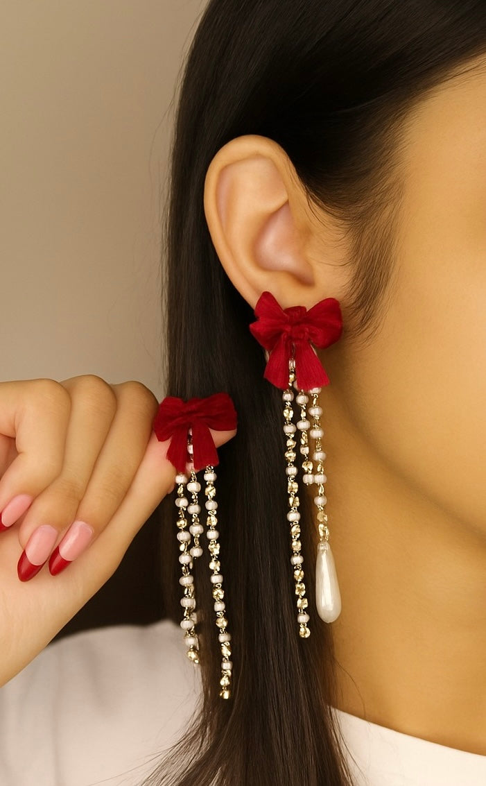 Playful charm meets festive sparkle in the Scarlet Bow Drops. Featuring deep red velvet bows paired with cascading pearl and crystal chains, these earrings strike the perfect balance between cute and couture. The mixed textures and movement add depth to your look, while the lightweight and anti-tarnish finish makes them an effortless yet head-turning choice.
