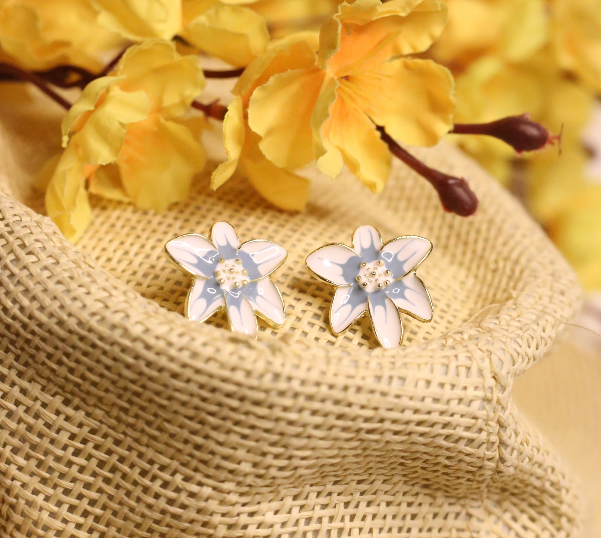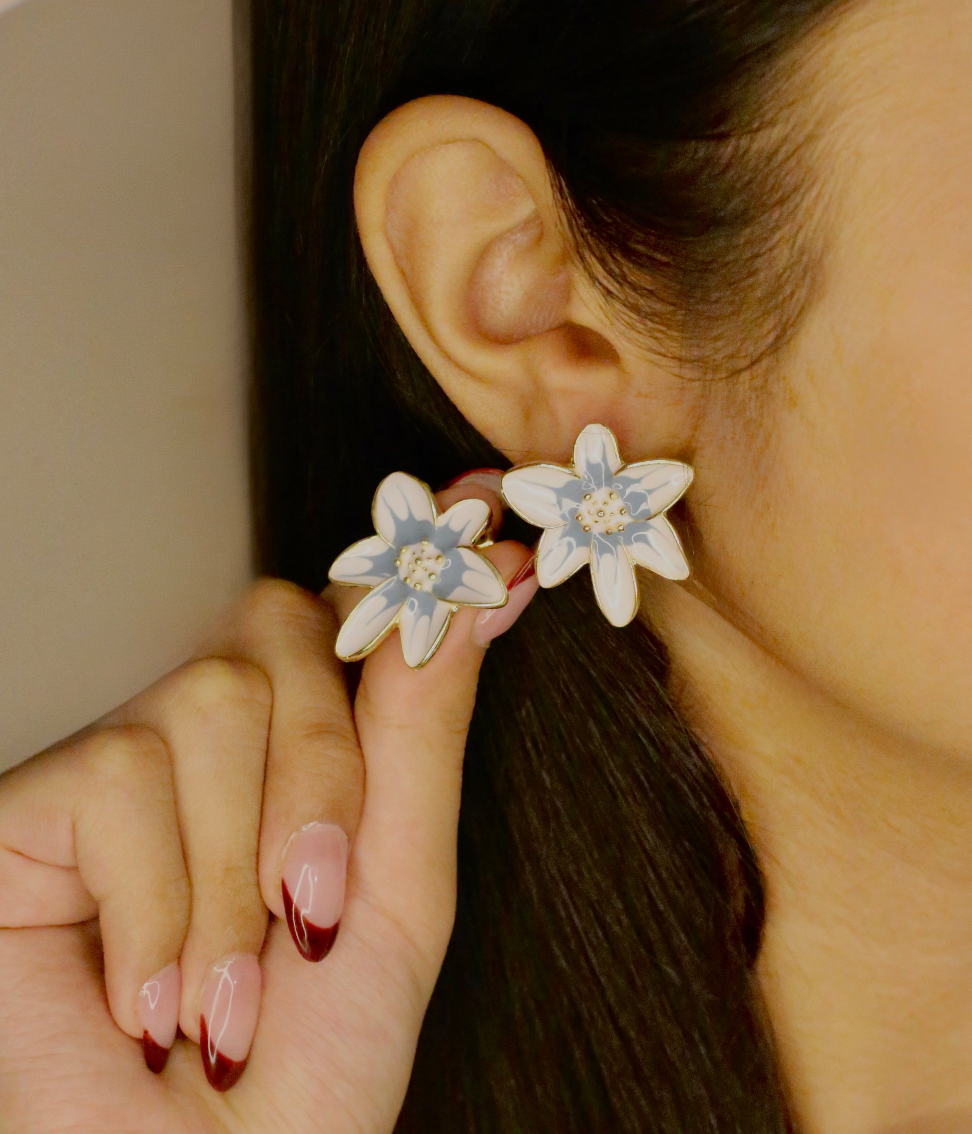 The Sky Petals are delicately crafted in soft sky-blue and ivory enamel petals, edged in gold and dotted with a gentle cluster at the center. Inspired by early spring blossoms and designed for effortless charm, these floral studs are equal parts playful and polished. Coated in an anti-tarnish finish and featherlight on the ears, they’re made for day-to-dusk dressing.